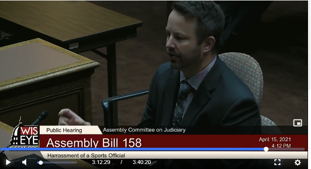 - On April 15, the Assembly Committee on Judiciary held a public hearing on Assembly Bill 158 which modifies the current harassment statute by increasing the penalty for harassment of a sports official from a Class B forfeiture to a Class A misdemeanor.