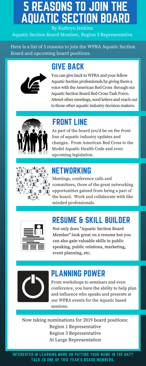 AquaticsPurpose:The goals of the Aquatics Section is to provide educational opportunities, foster communication and stay up-to-date on current code changes, trends and other aquatic-related news. It is imperative for aquatic professionals to stay up to do on codes, regulations and trends in the industry. The goal of the Aquatics Section is to be able to provide educational opportunities and to foster communication to allow aquatic professionals to stay current in their field. Dissemination of information regarding the American Red Cross, codes and newsworthy incidents is a main focus of this group. Tech Workshops, Seminars and Conference Sessions, along with publications in the Impact magazine and PR Monthly are all the ways we are consistently meeting our goals of keeping the WPRA membership informed. 2024 Aquatics Section Manual2025 Aquatics Section BoardMembers: